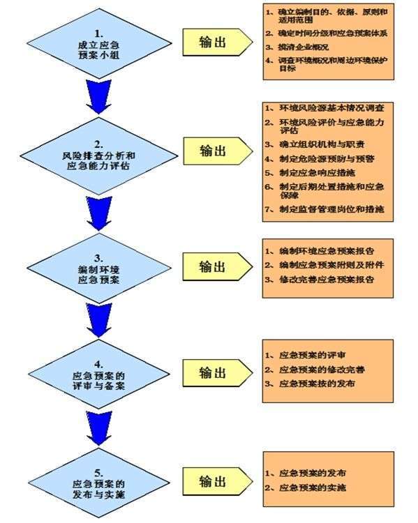1、总则,包括编制目的、编制依据、适用范围和工作原则等; 2、应急组织指挥体系与职责,包括领导机构、工作机构、地方机构或者现场指挥机构、环境应急专家组等; 3、预防与预警机制,包括应急准备措施、环境风险隐患排查和整治措施、预警分级指标、预警发布或者解除程序、预警相应措施等; 4、应急处置,包括应急预案启动条件、信息报告、先期处置、分级响应、指挥与协调、信息发布、应急终止等程序和措施; 5、后期处置,包括善后处置、调查与评估、恢复重建等; 6、应急保障,包括人力资源保障、财力保障、物资保障、医疗卫生保障、交通运输保障、治安维护、通信保障、科技支撑等; 7、监督管理,包括应急预案演练、宣教培训、责任与奖惩等; 8、附则,包括名词术语、预案解释、修订情况和实施日期等; 9、附件,包括相关单位和人员通讯录、标准化格式文本、工作流程图、应急物资储备清单等。 【环境应急预案服务流程】 企业提供基本信息》报价》接受委托》收集技术资料》现场调查》编制环境应急预案》组织专家评审》修改完善》指导企业应急预案备案 【环境应急预案编制流程】 应急预案 【环境应急预案服务周期】 常规一个应急预案的服务周期是20个工作日左右。 |